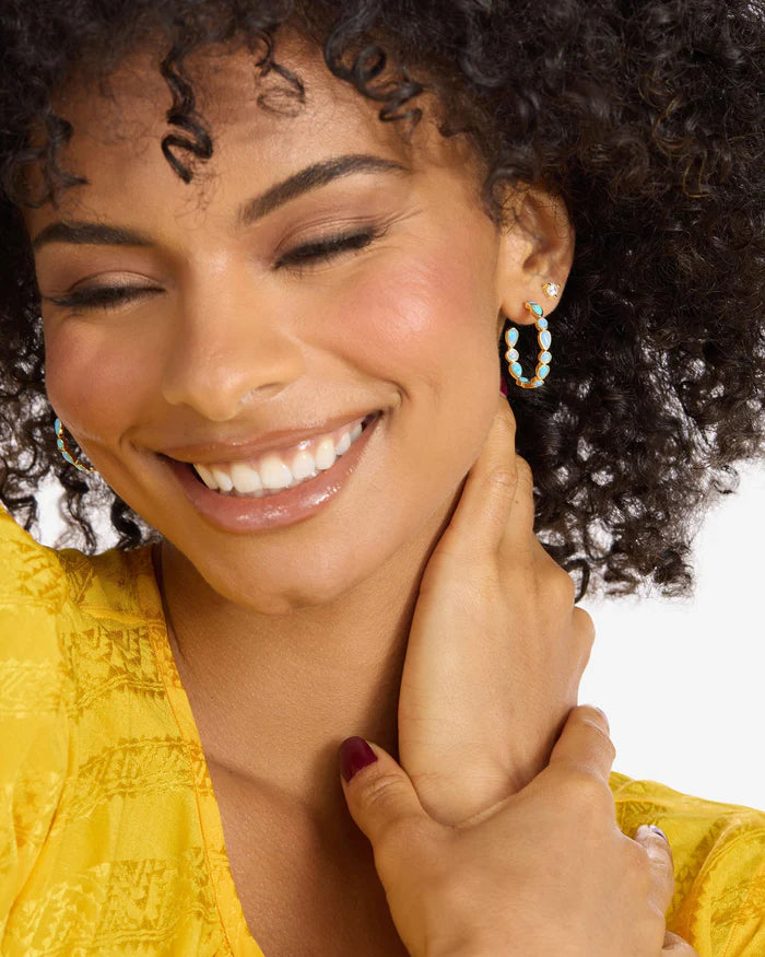The Isla Blue Opal Hoops (1") from Melinda Maria are your new glow-up in a hoop. Set in signature gold with inlaid flashes of dreamy blue opal, these stunners give just the right amount of color while still staying polished and wearable for every day. Lightweight and perfectly sized for that sweet spot between statement and subtle, they bring major energy without the heaviness. Whether you're dressed down in denim or stepping out in silk, they bring that effortless where-did-you-get-those? Because your ears deserve something that sparkles and speaks.