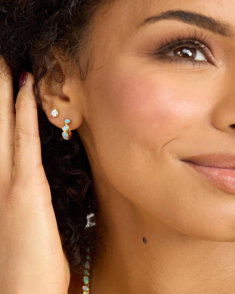 The Isla Huggies in Gold with Blue Opals are your new everyday essentials—with a pop of ocean-inspired color that feels like a vacation for your ears. Set in warm gold and lined with luminous blue opals, these mini hoops hug close for a snug, effortless fit that’s as comfortable as it is chic. They’re lightweight, layerable, and built to play well with others—but also bold enough to wear solo when you want that subtle standout energy.