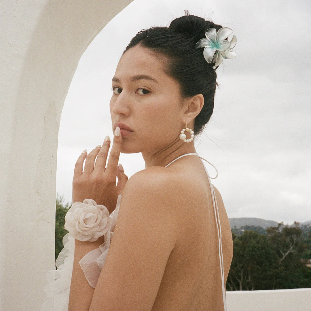 Inspired by the plumeria flower, the super bloom hair clip represents love and new beginnings. Effortless yet playful, this claw clip is large enough to hold a full head of hair, now available in Aqua Pearl.