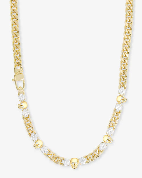 Embodied by those who live for effortless style and impeccable attention to detail. This Cuban chain necklace adorned with skulls and simulated diamonds adds a daring element to any ensemble. Confident, sophisticated, and indulgently opulent..
