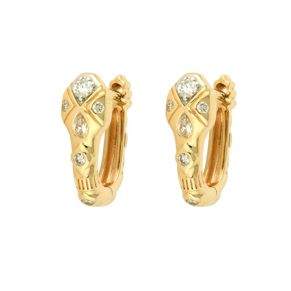 Embrace the allure of serpentine style with these exquisite Copperhead Diamond Snake Huggie Hoops from Three Stories. Meticulously crafted in 14K gold, each piece showcases an intricately rendered snake design embellished with brilliant diamonds that trace the creature's elegant curves. The copperhead-inspired silhouette hugs your earlobe with graceful sophistication, casting mesmerizing reflections of light and shadow. Blending timeless symbolism with contemporary luxury, these statement huggies elevate any ensemble with an air of refined mystique. Layer them with other Three Stories designs or let them shine independently. Sold as a pair.