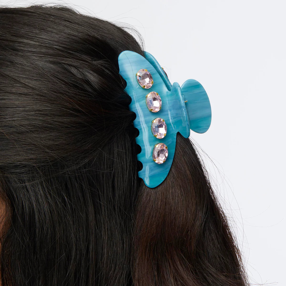 Cool, bold, and a little bit dazzling. The Lele Sadoughi Azure Large Crystal Claw Clip makes even a quick updo feel styled. Crafted in a rich ocean-blue resin and hand-set with sparkling crystals, it catches the light in the most effortless way. Oversized for maximum hold, this claw clip isn’t just practical—it’s the statement accessory your hair has been waiting for. Perfect for polished nights out or adding a touch of glam to your everyday routine.