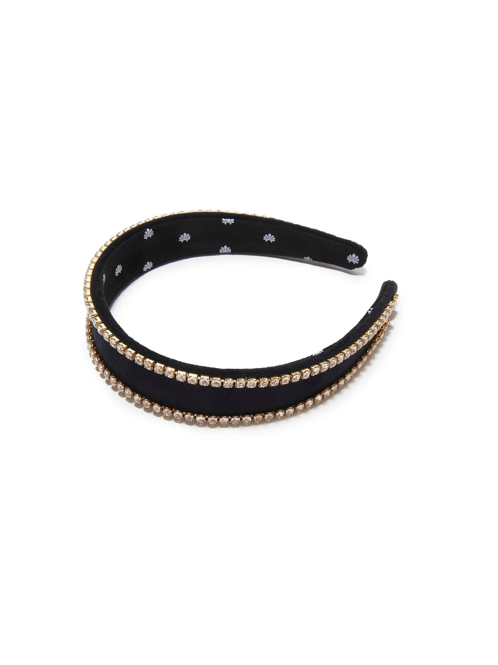 Crafted in homage to Carolyn Bessette's timeless elegance, this headband features a sleek flat band design that captures understated luxury and refined sophistication. Now in a Jet colorway with crystal detail on the edges.