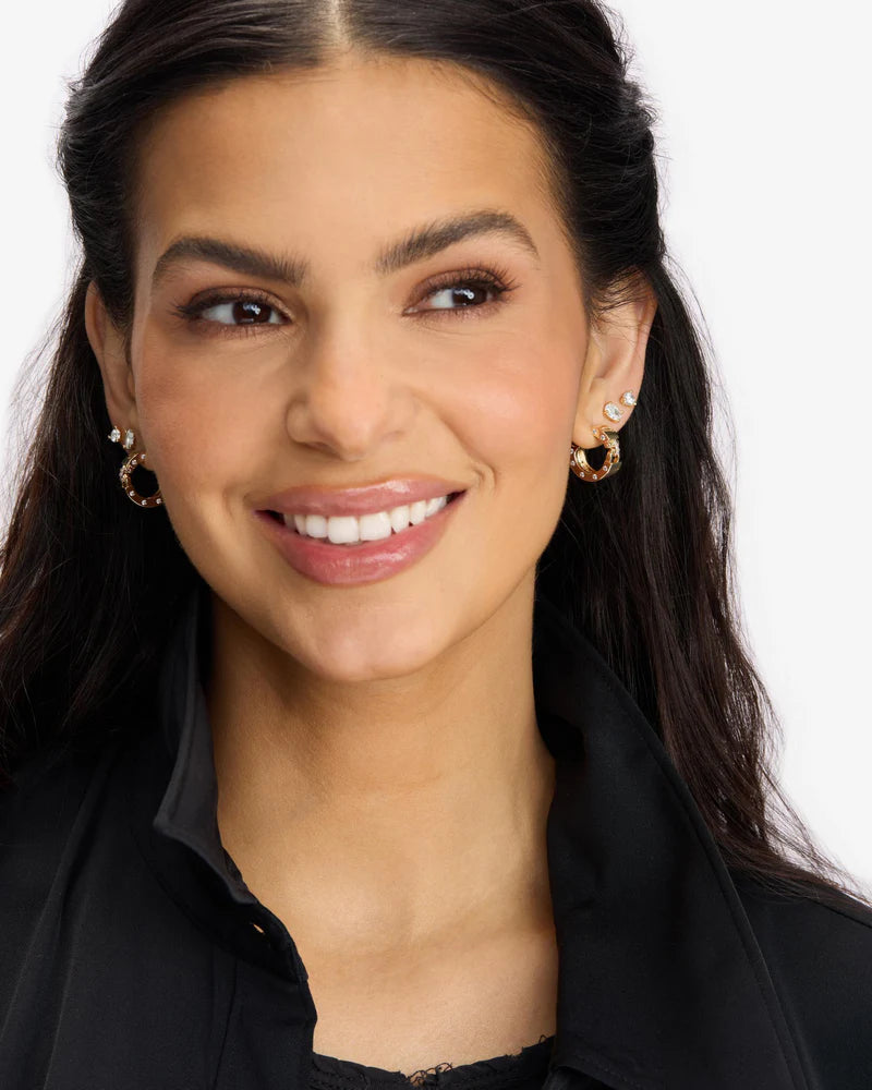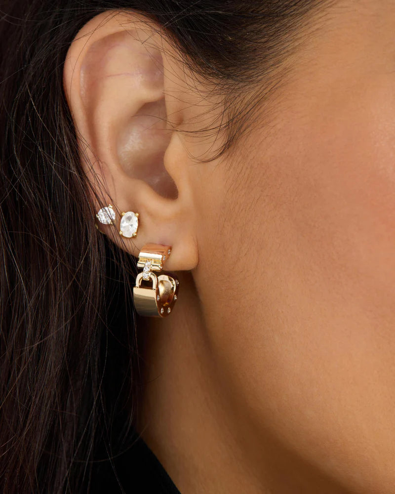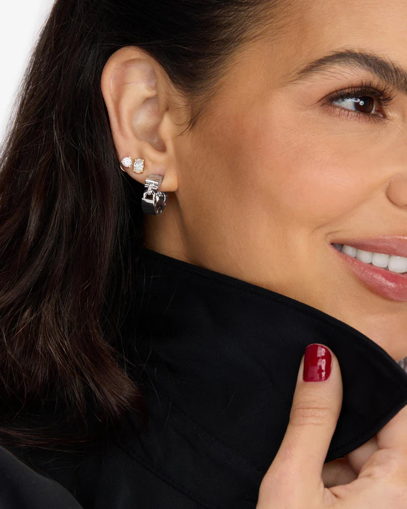 These sleek huggies mean business with their lock-inspired detailing that adds an edgy twist to a timeless design. Crafted for everyday wear, they're the perfect accessory to anchor your rotation—literally. Small enough to stay subtle, bold enough to make a statement. Lock them in as your new go-to pair. And, the placement of the white diamonettes bring just enough sparkle.