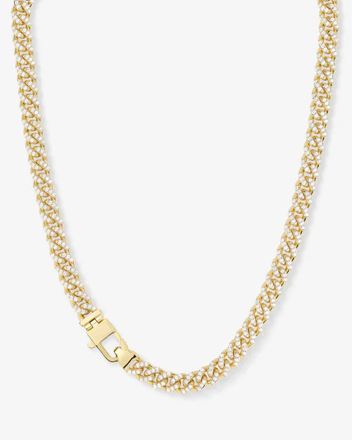 The perfect fusion of chains and diamonds - the Cuban style chain, now adorned with dazzling pavé diamonds. The Julian Cuban Chain Necklace in 6.8mm exudes confidence as the star of any ensemble, while also lending itself to layering. Its timeless appeal and sophisticated design make it a standout piece fit for any leading role.