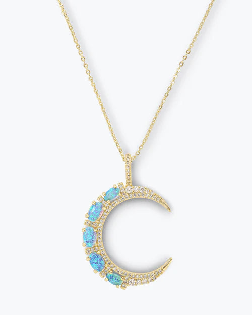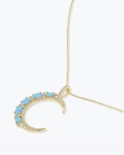 Celebrate your luminous presence with this striking crescent moon pendant, where graduated simulated blue opal stones catch the light in a mesmerizing display of celestial beauty. The prong-set design showcases each stone's radiant depth, while delicate pavé accents frame the composition with refined elegance. A sophisticated choice for those who command attention and inspire admiration, this necklace transforms any moment into an opportunity to radiate confidence and timeless allure.