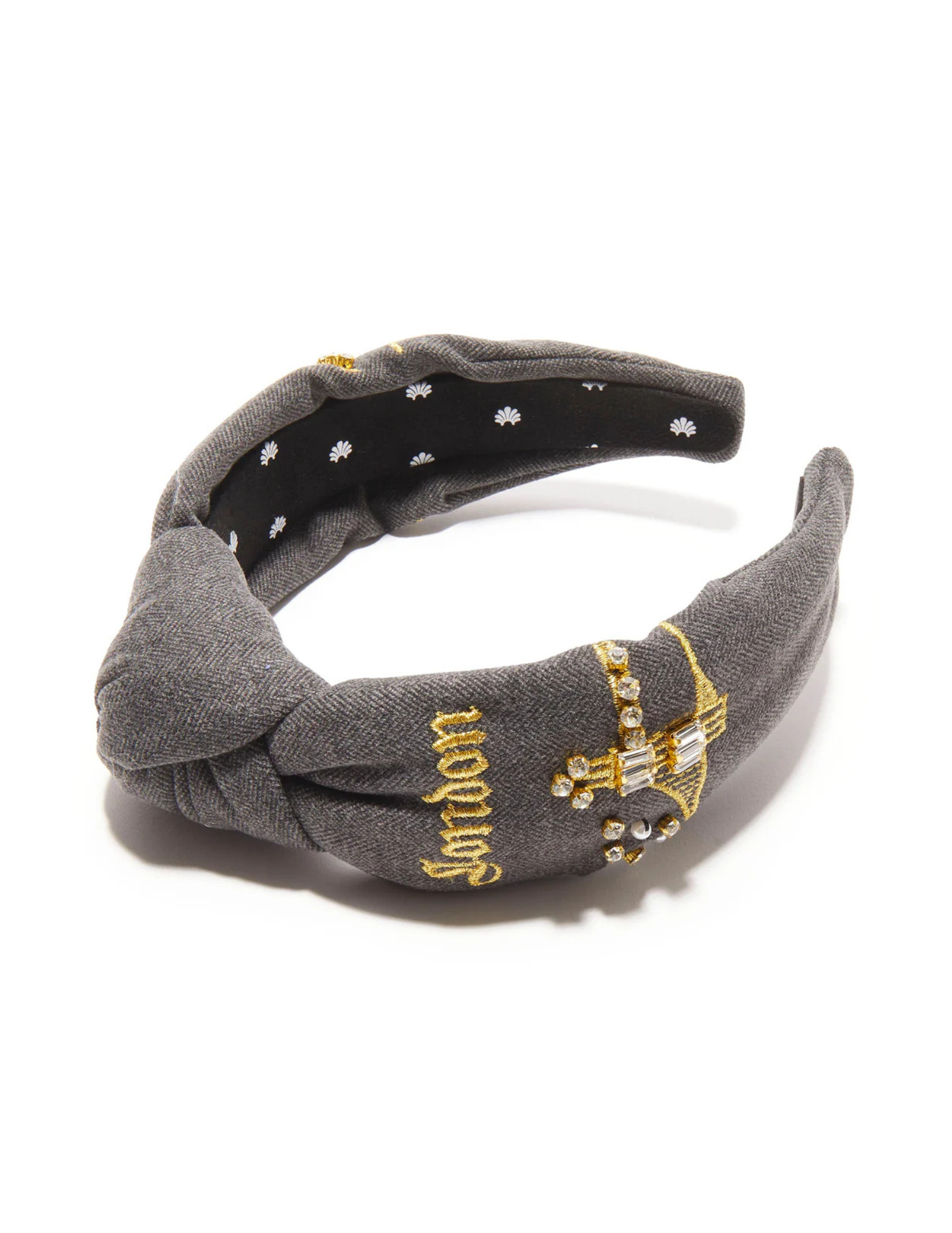 - Gold lurex embroidery of London and The Tower Bridge silhouette on both sides