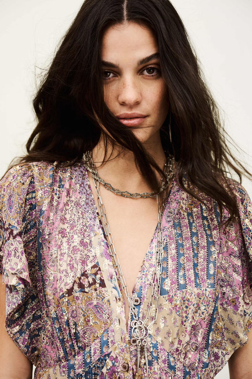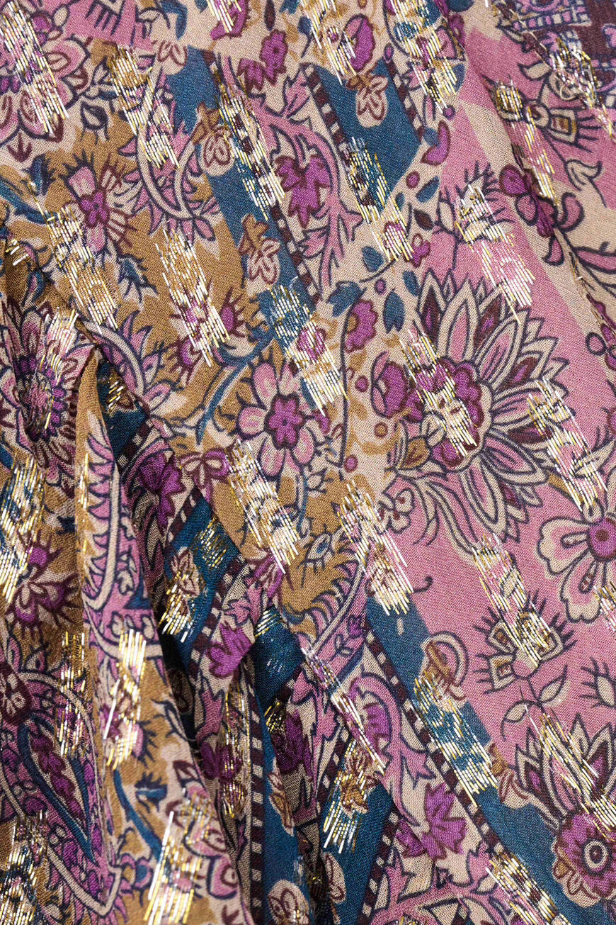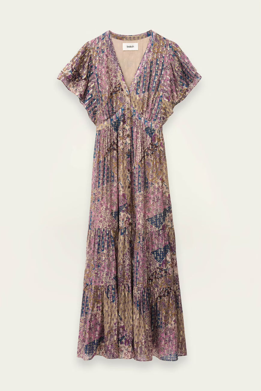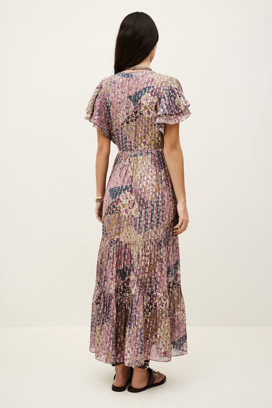 Effortlessly chic midaxi dress that captures bohemian romance with French polish. Crafted in soft viscose from sustainably managed forests, it features a flattering V-neck, front button placket, and a pointed waistband that creates gentle gathering below. Ruffled skirt panels dance with movement, while short sleeves sport playful double ruffles. The stunning rose print is kissed with delicate gold lurex brushstrokes for just the right amount of sparkle. Your new go-to for days when you want to feel both relaxed and utterly refined.