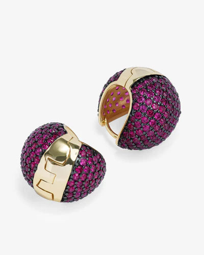 Forget understated elegance—these show-stopping earrings are here to steal the spotlight. Packed with pavé set simulated rubies in MM's signature Snowflake Pavé design, they layer three stone sizes (0.5 mm, 1 mm, and 1.25 mm) for maximum sparkle and dimension. The result? A bold, sculptural look that commands attention without weighing you down.