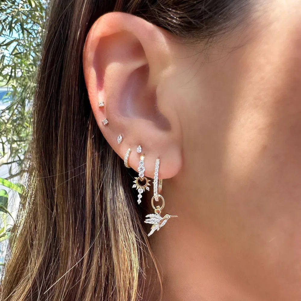 We like to show this paired with the following (as shown in the image on the models ear, second piercing) Three Stories Diamond Prong Small Engraved Hoop