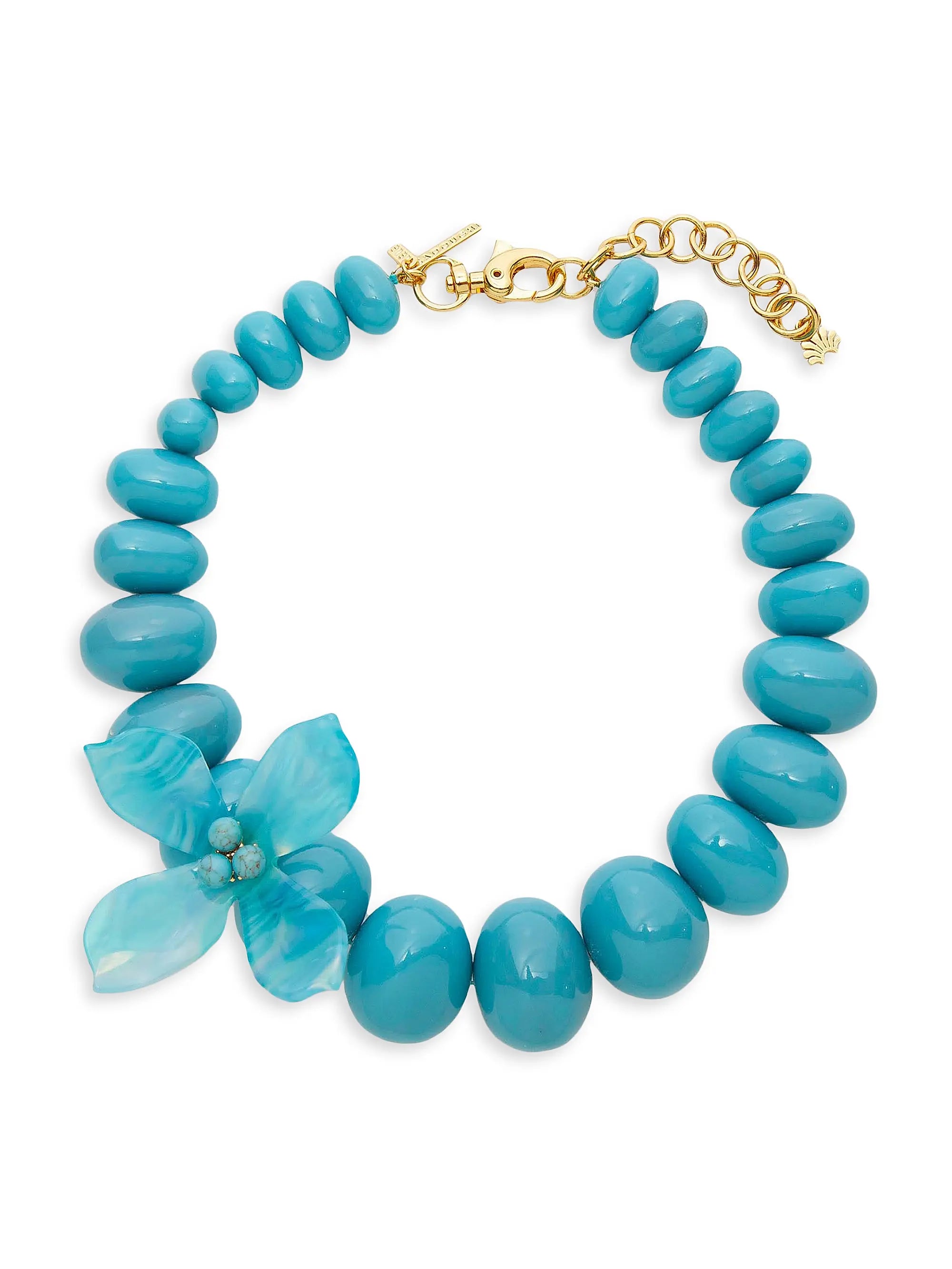 The Lele Sadoughi Turquoise Oleander Necklace is a breathtaking fusion of elegance and nature-inspired beauty. Featuring turquoise colored petals delicately arranged in a floral design, this necklace radiates sophistication and timeless charm. The soft, iridescent glow of the turquoise color combined with the intricate craftsmanship creates a piece that’s both delicate and striking. Perfect for adding a touch of femininity and grace to any outfit, this necklace transitions seamlessly from day to night, making it a must-have for those who appreciate refined luxury and the beauty of nature.